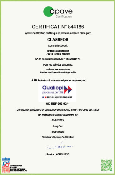 Un auditeur indépendant a estimé que Classeos était conforme aux exigences requises pour Qualiopi pour les deux processus « Actions de Formation » et « Centre de Formation d’Apprentis ».